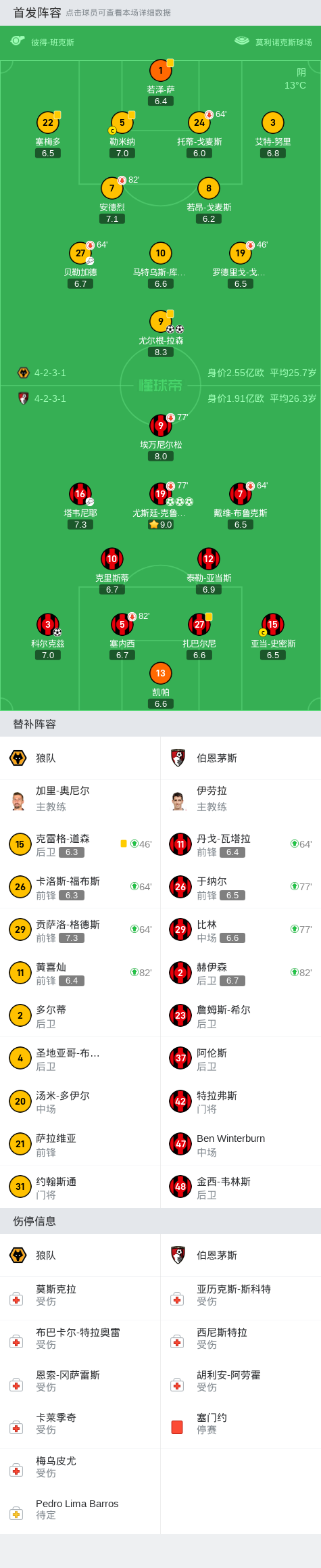 英格兰足球顶级联赛的第13轮比赛中,狼队在主场迎战伯恩茅斯。整个比赛过程中,球员们士气高昂,球迷们也热情高涨。双方在赛前准备充分,都希望在本场比赛中取得胜利。看台上的球迷们挥舞着各自球队的旗帜,激情呐喊,场面热烈而壮观。